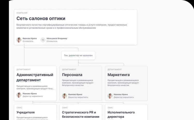 Соберите оргструктуру на базе готовых шаблонов: задайте роли, зоны ответственности и подчинённость.